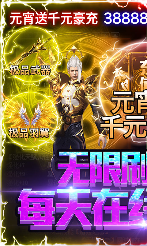 1、上线送V14,千元充值卡,38888元宝