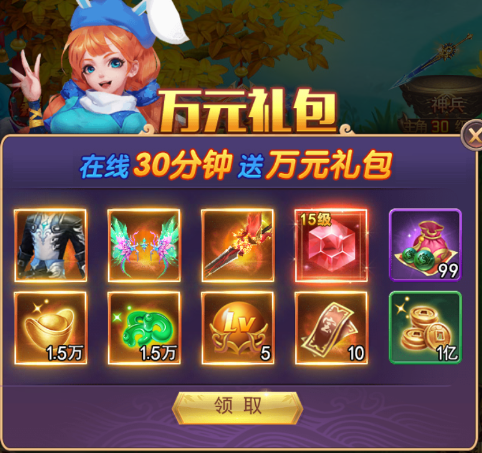 单日累计充值10000元:获得雷震子图鉴*100,牛魔王图鉴*100,太阿剑式⑥*80,20级宝石礼盒*5,灵脉提升礼包*150
