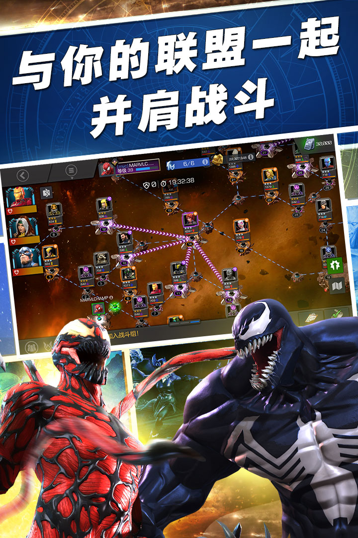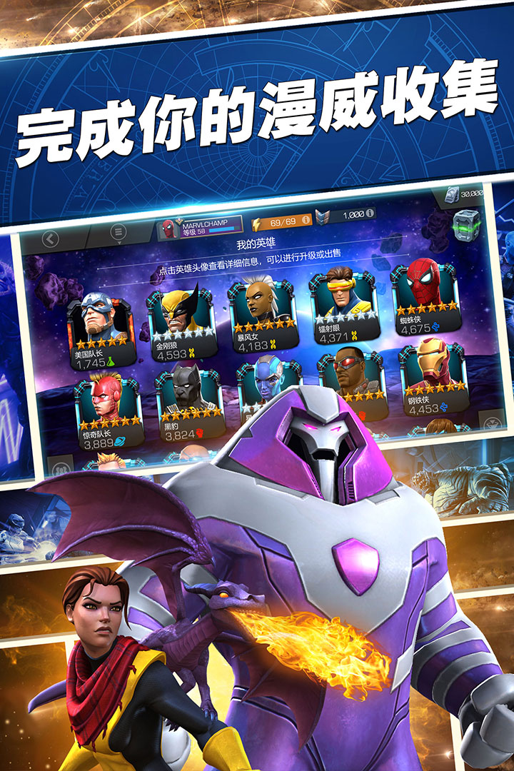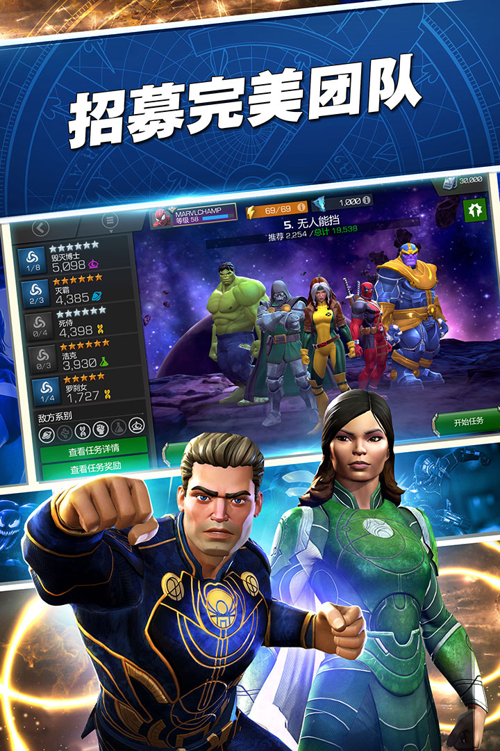 收集, 升级 ,并根据漫威 漫画 情节中的人物关系,妥善地安排队伍中的英雄和反派成员来获得队友加成
