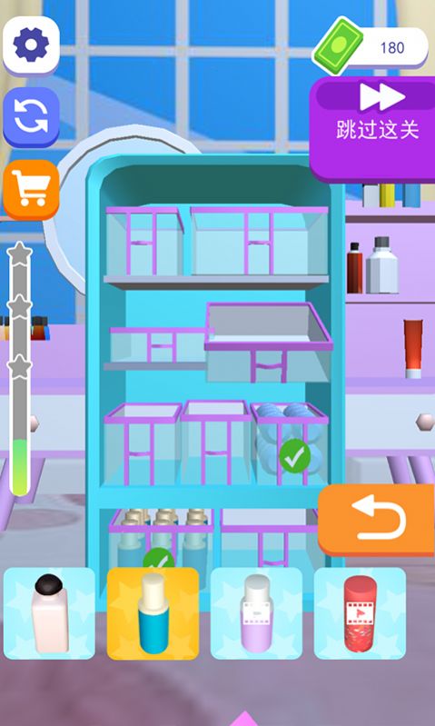 3、每个关卡所提供的化妆品柜各不相同,你必须把所有化妆品都整齐地放进柜子里才行!