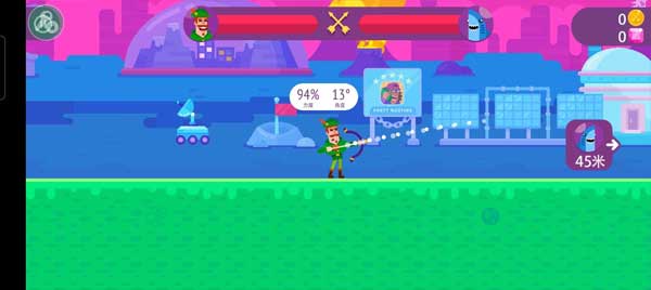 3、右边会有距离提示给你,你可以根据射击的弧度和力度来将另一边的人射中。