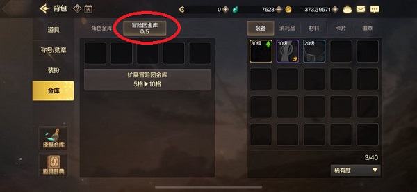 2、在仓库中点击【金库】-【冒险团金库】,然后选择你的史诗装备,将它转移到【冒险团金库】中。