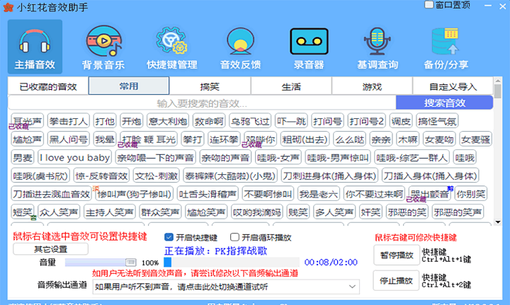 丰富的音效库: 小红花音效助手提供了一个非常丰富的音效库,包含了各类音效,例如:环境音效、搞笑音效、背景音乐、游戏音效、特效音、声音道具等。无论是用于视频编辑、直播配音,还是日常娱乐,用户都能找到所需的音效素材。
