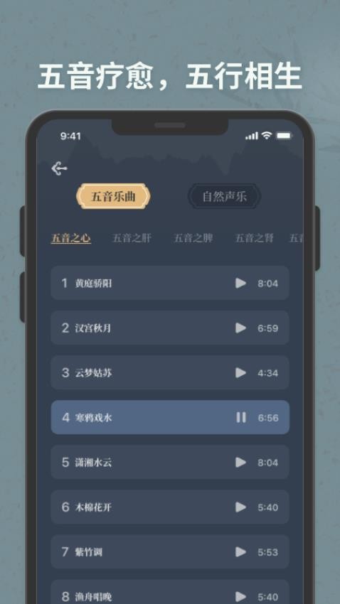 用户可进入到五音乐曲中心来选择到五音乐曲音频进行播放助眠疗愈使用。