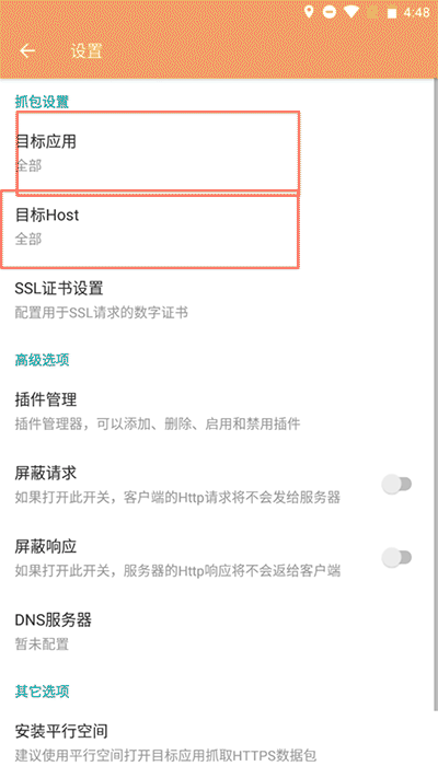 3、之后就在设置里面添加抓包的目标或者host。